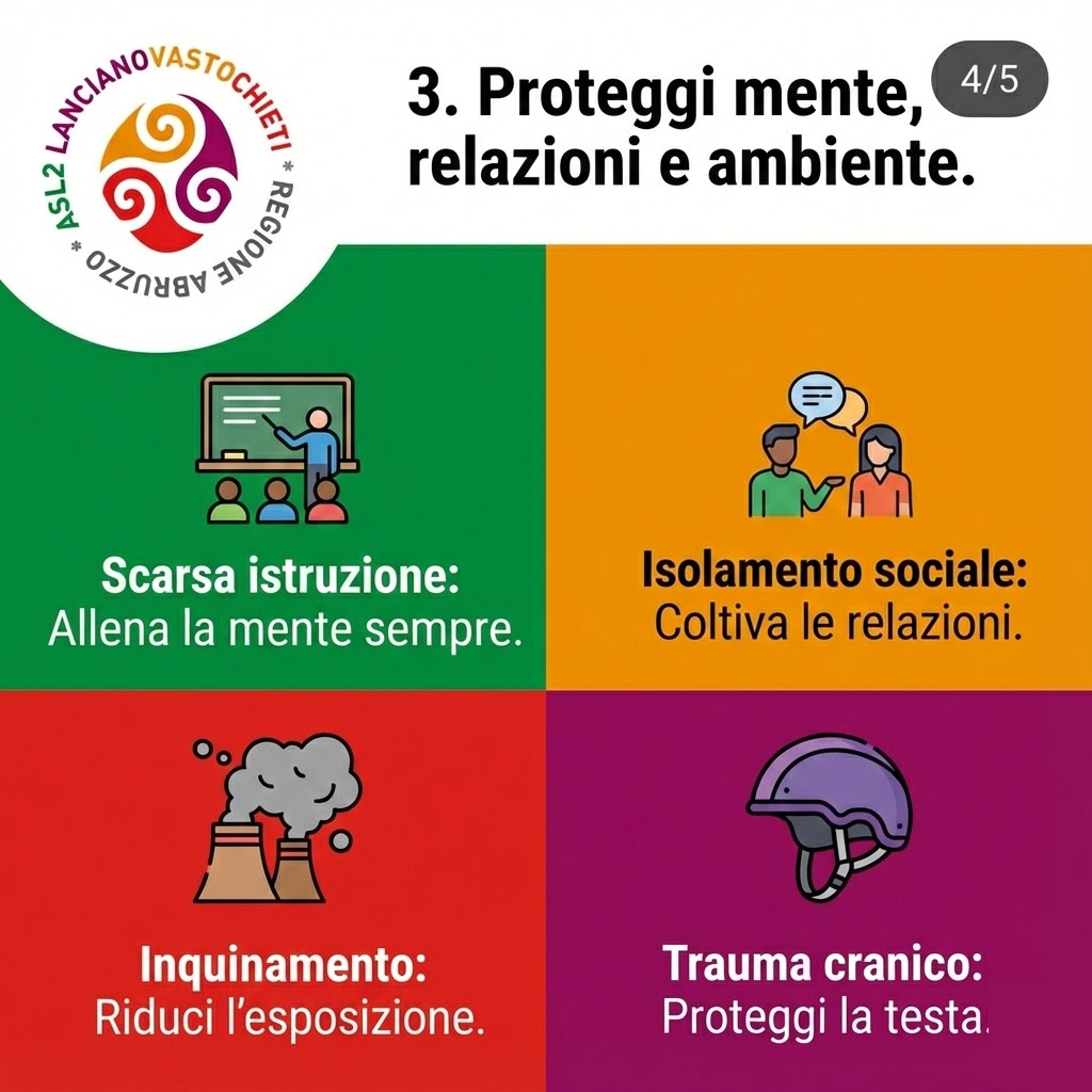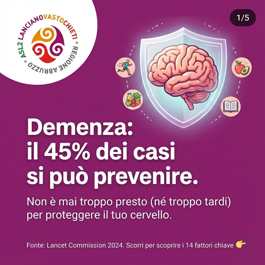 Quasi la metà dei casi di demenza potrebbe essere evitata o ritardata: intervenendo tempestivamente su 14 fattori di rischio modificabili, è possibile abbattere l’incidenza della malattia fino al 45 per cento. È il dato scientifico, emerso dalle stime 2024 della Lancet commission on dementia prevention, da cui parte la prima “Giornata nazionale delle demenze”. La Asl Lanciano Vasto Chieti apre le porte dei suoi centri specializzati: lunedì 15 dicembre 2025 sarà possibile sottoporsi gratuitamente a uno screening della memoria e ricevere consulenze sulla salute cerebrale.