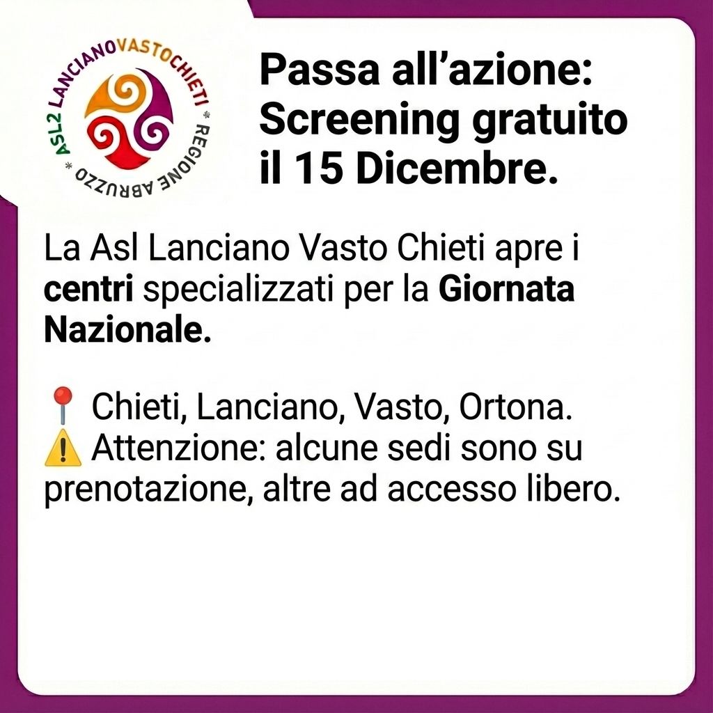 - Ortona (distretto sanitario): piazza San Francesco 4. Screening dalle ore 8.30 alle 11.00 (referente Sara Antenucci).