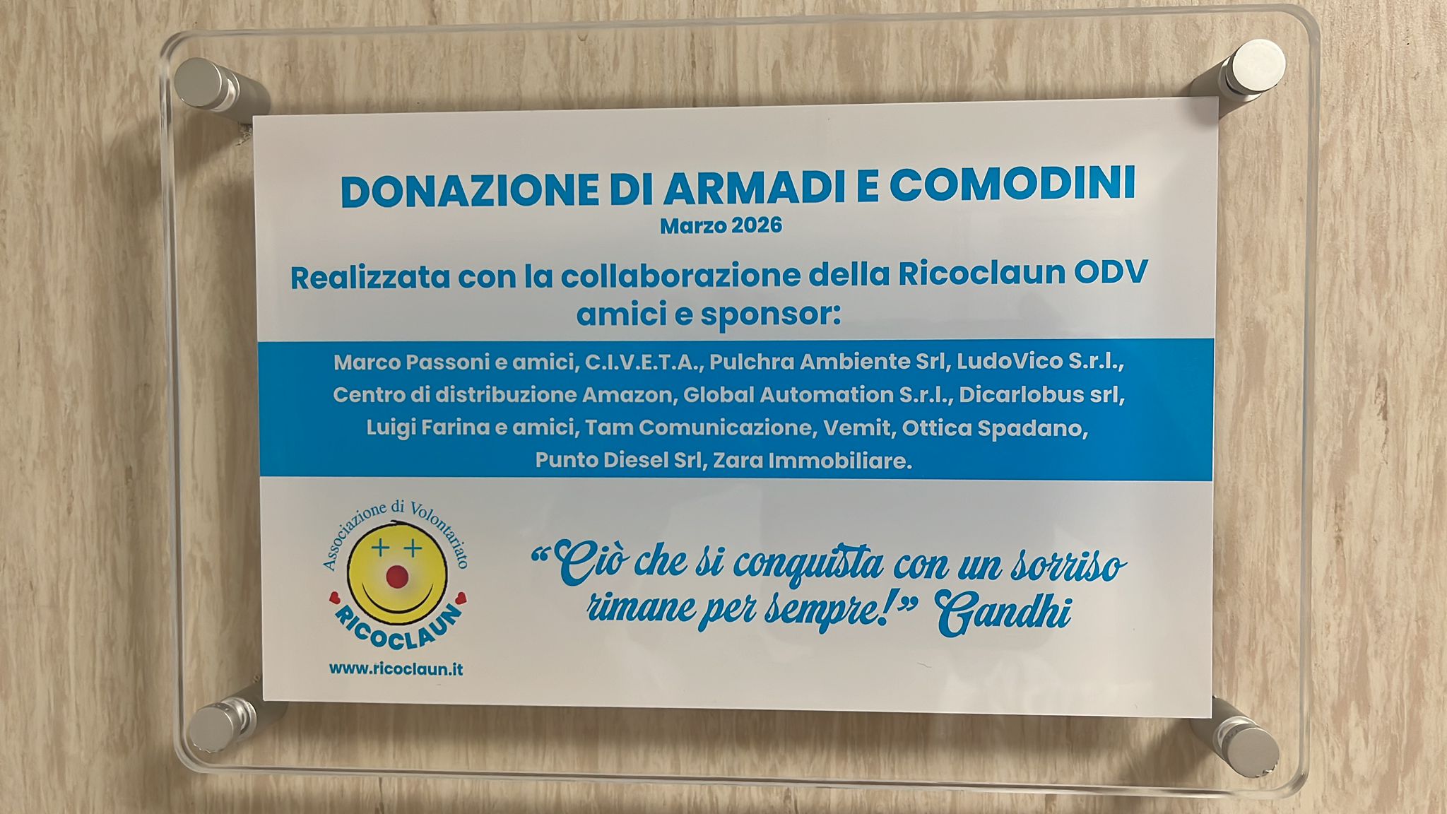 Hanno partecipato al progetto anche Marco Passoni e i suoi generosi amici, Punto Diesel, Zara Immobiliare, oltre a numerose coppie di sposi che hanno scelto le pergamene solidali Ricoclaun e tanti cittadini che hanno contribuito con donazioni private.